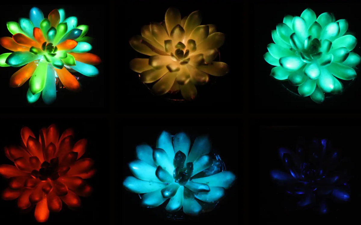 Китайские исследователи разработали технологию, благодаря которой суккуленты начали излучать яркое зеленое, синее или красное свечение. Для этого растения самостоятельно накапливают энергию от солнца в течение дня.
