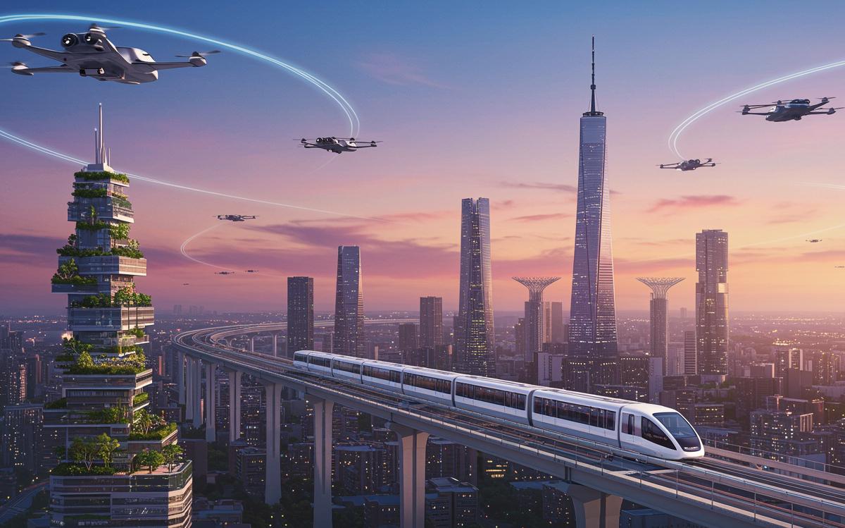Подземная транспортная система состоит из автоматизированных логистических узлов и автономных грузовиков. Небольшие роботы перемещаются и по поверхности. Для перевозок людей есть также летательные аппараты вертикального взлета и посадки. Площадки для них оборудованы на башнях-хабах, которые также выполняют функции жилых зданий и офисных центров. Основным источником энергии для города выступают водородные топливные элементы, а для доставки водорода и распределения электричества используются умные сети.