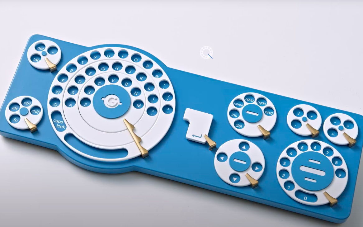 Конструкция клавиатуры включает восемь дисков разной формы, за каждым из которых закреплена своя группа символов: буквы, цифры или знаки препинания. В центре устройства расположена крупная клавиша ввода — это тоже диск.