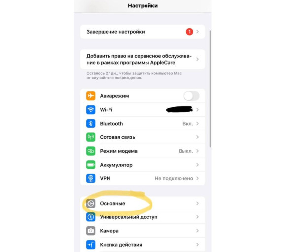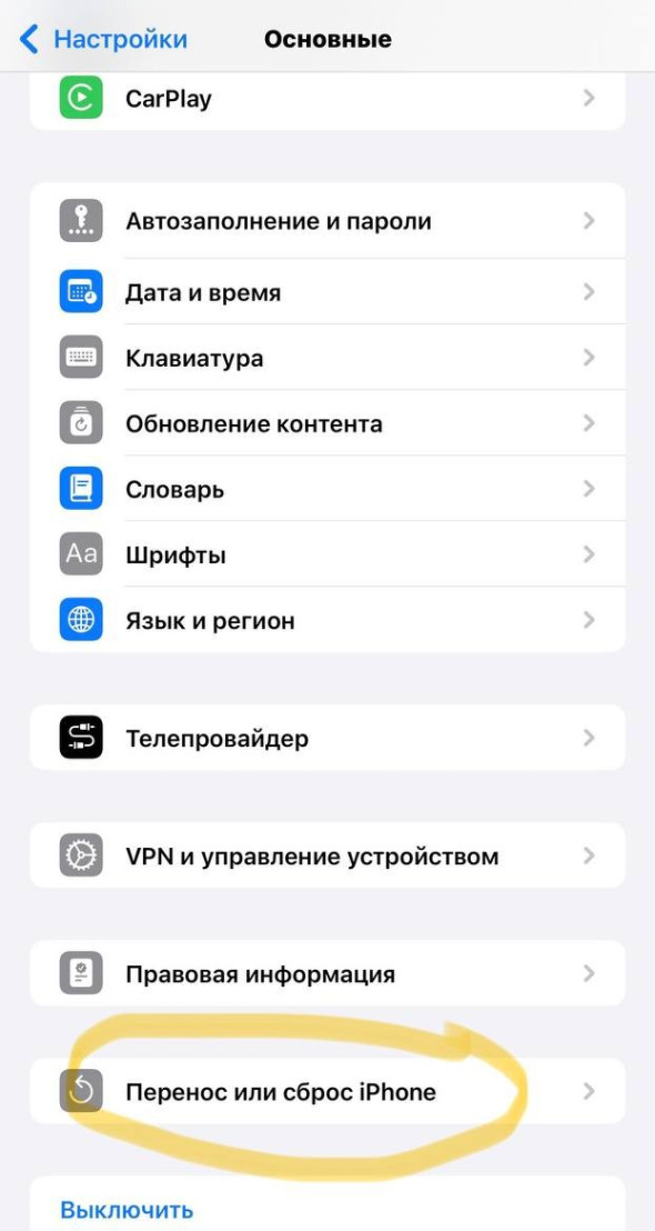 - Перейти в раздел «Основные» — «Перенос или сброс iPhone»;