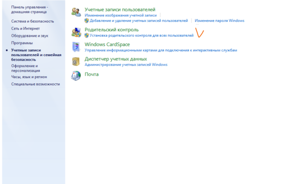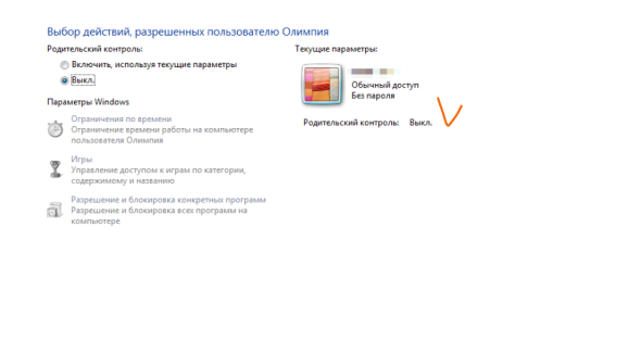 - Windows 7. Войти в «Панель управления», перейти в «Учетные записи и семейная безопасность», выбрать аккаунт ребенка, поставить галочку напротив «Выкл» и нажать «ОК».