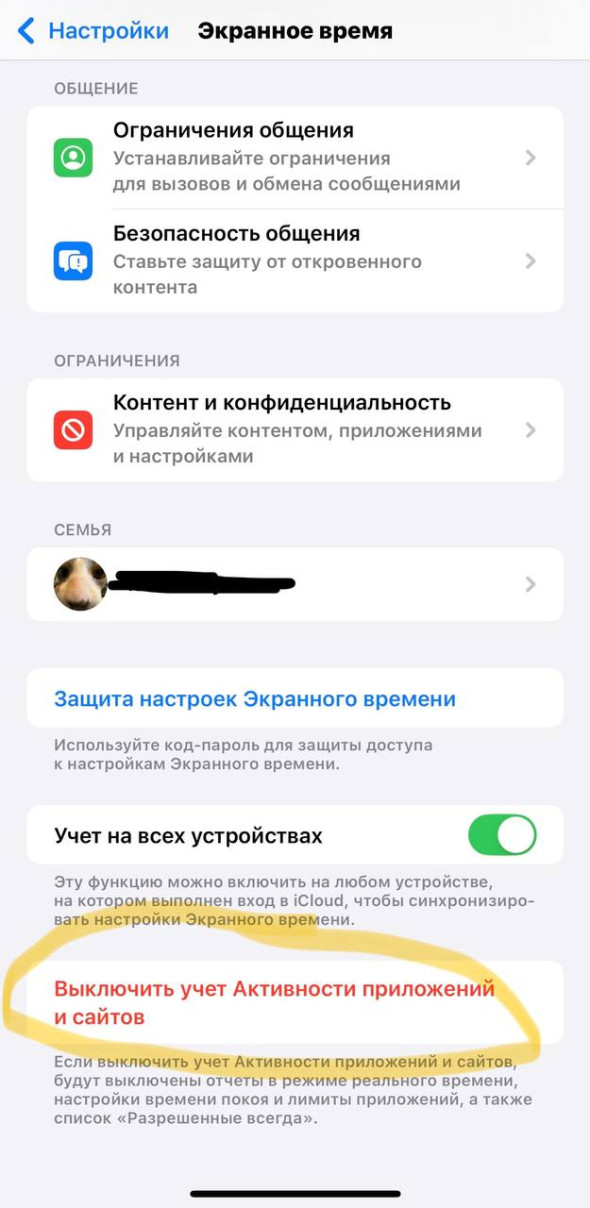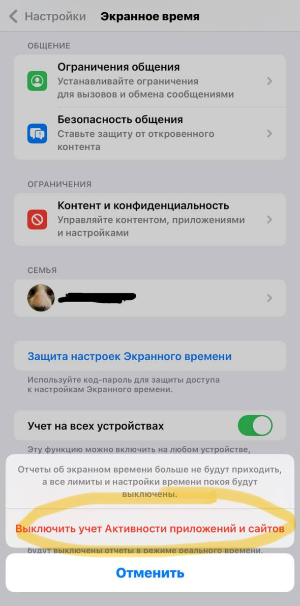 - С паролем. Зайти в настройки телефона ребенка, перейти в «Экранное время» — «Выключить учет активности», ввести пароль и выбрать «Выключить учет активности приложений и сайтов».