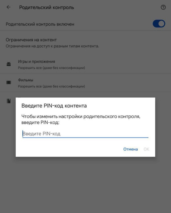 - Ввести пин-код, заданный во время включения родительского контроля, и нажать «ОК».