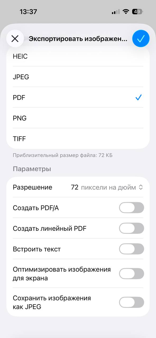 Также на IOS-устройствах можно воспользоваться встроенной программой «Просмотр». Она позволяет сжать PDF‑документ или экспортировать его в файл формата HEIC, JPEG, JPEG-2000, PDF, PNG или TIFF [16]. Чтобы применить опцию, потребуется: