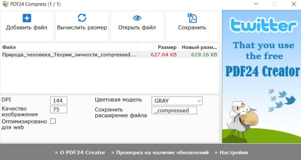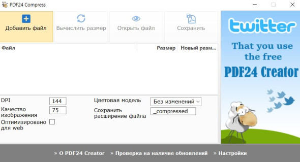Этот бесплатный русскоязычный сервис ориентирован на работу с PDF-документами, в том числе он предлагает опцию сжатия. Чтобы воспользоваться им, нужно сначала загрузить программу на ПК [4]. Затем потребуется: