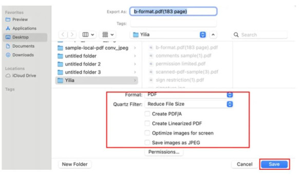 - при выборе места сохранения файла указать параметр Reduce File Size и найти строку «Фильтр Quartz», где потребуется выставить параметр Reduce File Size;