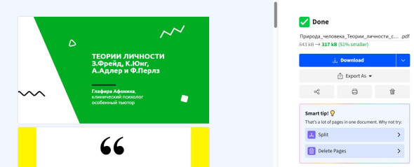 - Чтобы уменьшить размер PDF-файла без потери качества, можно убрать метаданные и отказаться от цветных картинок. Есть специализированные сервисы, которые автоматически выполняют такое форматирование.
