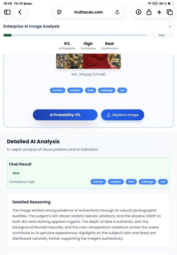 Сгенерированный и реальный портретный снимок были определены верно и с высоким процентом уверенности. Это число отражает, насколько алгоритм убежден, что перед ним ИИ-кадр. В отчетах Decopy AI обращает внимание на такие детали, как выражение лица, текстура кожи и волос, фон и освещение.