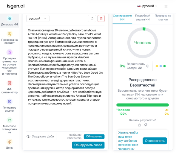 Один из самых детальных и точных детекторов. Подойдет тем, кто ищет расширенный функционал в бесплатной версии и хочет узнать, на основании чего сервис принимает решение.
