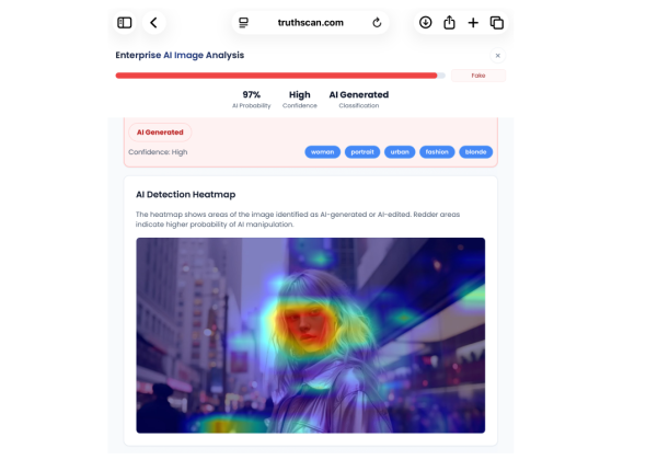 Сервис с высокой точностью (более 90%) отличил сгенерированный портрет от реальной фотографии. В расширенном отчете после регистрации указал признаки ИИ: идеализированные черты, неестественные текстуры и освещение, непоследовательное размытие фона. При проверке реального фото отметил реалистичные тени и текстуру кожи, а также освещение и колебания цветовой температуры.