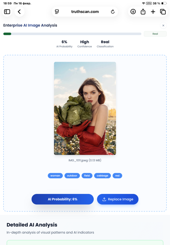 Мы загрузили фотографию из журнала Vogue. Результат: 97% вероятность того, что это реальное фото, а не ИИ.