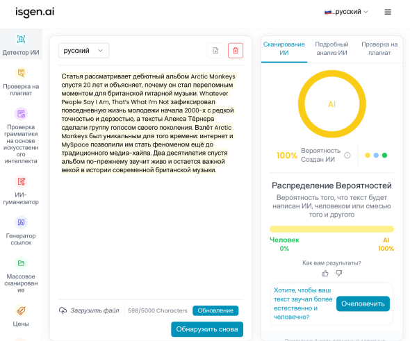 Бесплатный ИИ-детектор с поддержкой русского языка, который предоставляет 1 тыс. проверок ежедневно. В описании сказано, что он проверяет текст, созданный такими языковыми моделями как ChatGPT, Claude, Gemini, LlaMa и др. Текстовое поле вмещает до 200 тыс. символов. Из дополнительных функций: есть кнопка «гуманизация», т.е. возможность автоматически «очеловечить» текст.