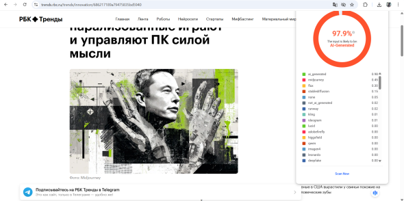 Сервис верно определил реальную фотографию из в статьи «РБК Трендов» (вероятность ИИ — 1%), и сгенерированную в Midjourney обложку, указав на диаграмме модель-источник. Проверка происходит за считанные секунды.