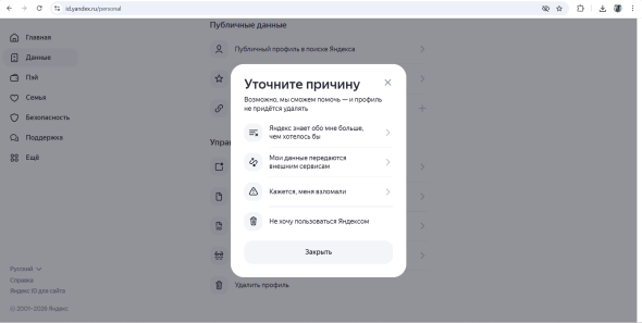 «Яндекс» для пользователя давно уже не просто почта и поисковая система, а множество приложений: «Диск», «Такси», «Музыка», «Книги», «Плюс», «Маркет», «Еда», «Кинопоиск». Все они связаны единым аккаунтом — «Яндекс ID». Так что удаление такого профиля — серьезный шаг, после которого вы необратимо теряете не только доступ к этим сервисам, но и все данные, которые в них хранятся. А это письма в почте, файлы в облаке, баллы в «Плюсе», платежные данные и подписки, промокоды и баллы в «Яндекс Маркете», а также детские аккаунты, если вы администратор семейной группы.